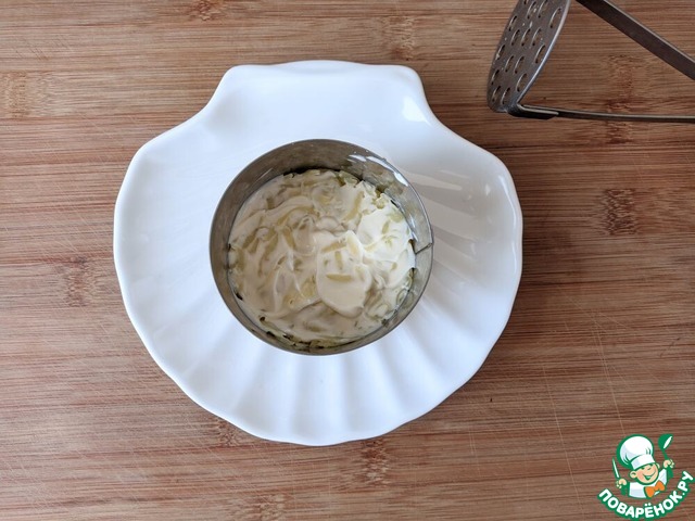 Кладём картофель в кольцо, солим, перчим, слегка приминаем, смазываем майонезом.