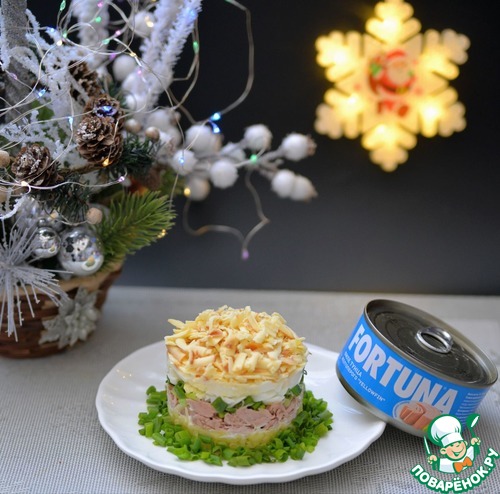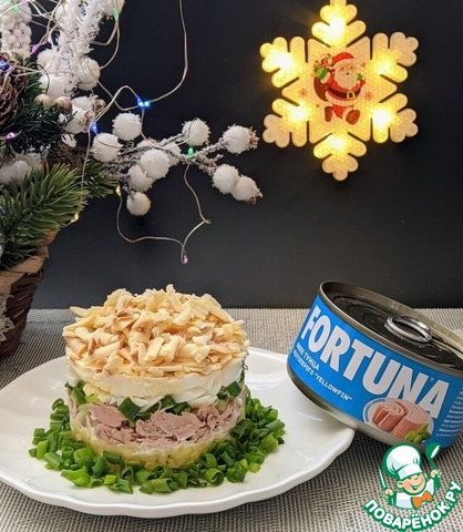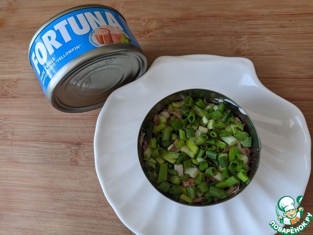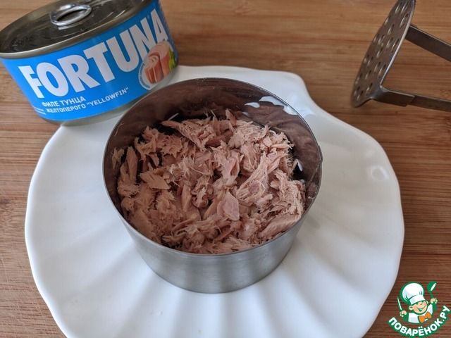 Тунец (без жидкости) слегка разминаем вилкой, кладём следующим слоем. У меня - филе тунца желтоперого ТМ FORTUNA. Этот слой можно не мазать майонезом.