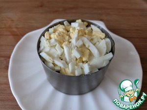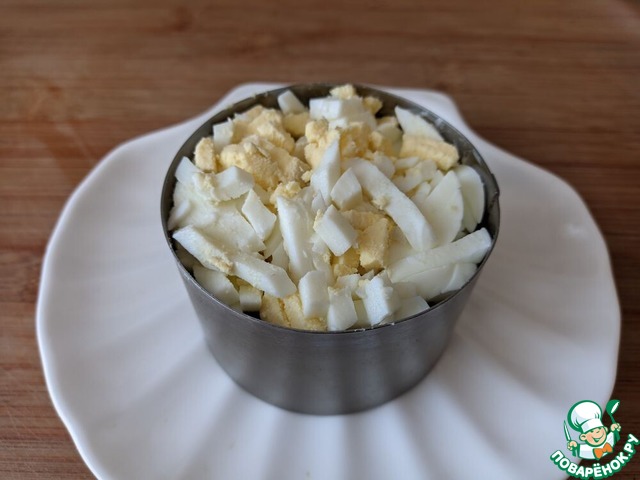 Следующим слоем кладём мелко-порезанное яйцо. Я использую яйцерезку. Слегка приминаем. Смазываем майонезом.