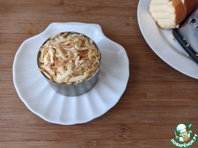 Колбасный копчёный сыр трём на тёрку. Хочу отметить, что здесь этот продукт имеет большое значение, поэтому не берите дешёвый сырный продукт. Кладём сыр верхним слоем. Этот слой не приминаем, чтобы оставались "кудряшки". Ставим салат в холодильник пропитаться.