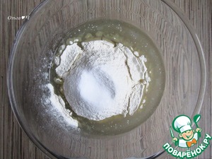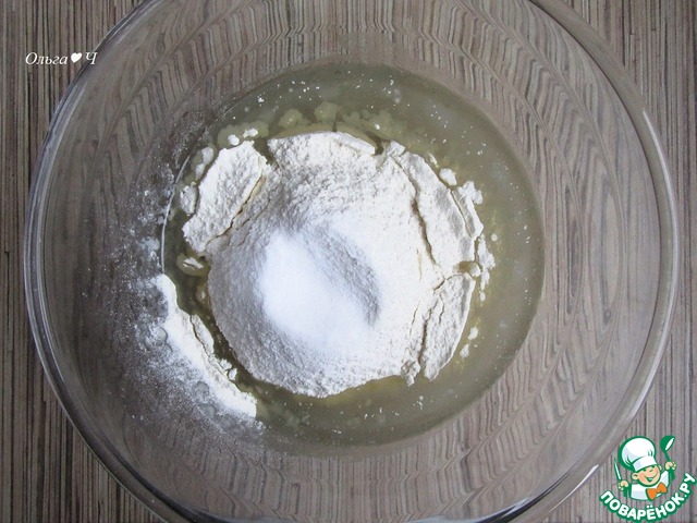 Всыпьте половину муки с разрыхлителем, перемешайте.