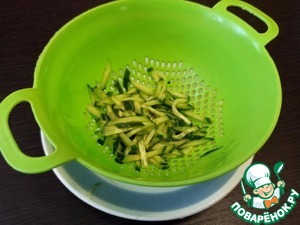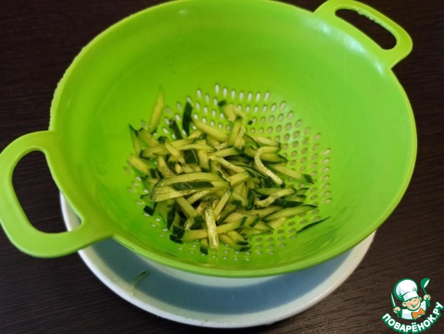 Свежий огурец нарезать соломкой, добавить по щепотке сахара и соли, оставить в дуршлаге на 10-15 минут, чтобы стекал сок. Перед использованием немного отжать.