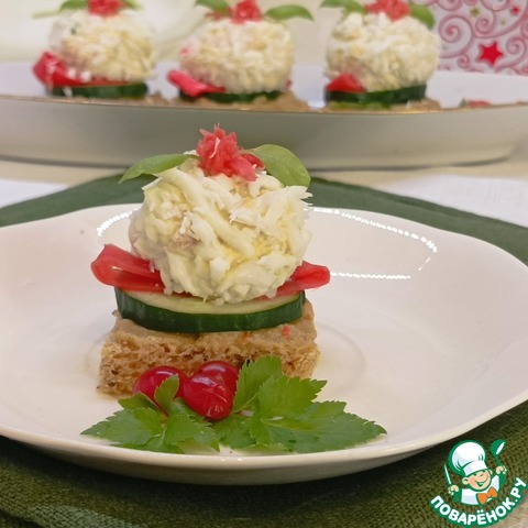 Теперь собираем. Кусочки хлеба смазываем горчицей, сверху укладываем огуречный кружок, пластиночки имбиря. Берем чайную ложку основной массы, выкладываем ее на панировку, перекатываем, формируя шар. Помещаем его на огурчик. Украшаем зеленью и рубленым маринованым имбирем.