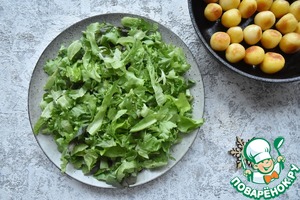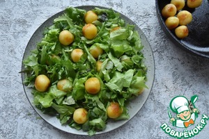 На большое плоское блюдо выкладываю смесь салатных листьев. -