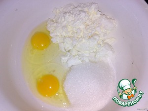 Для теста смешиваем два яйца, 250 г творога и 0,5 стакана сахара.