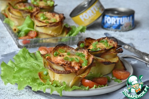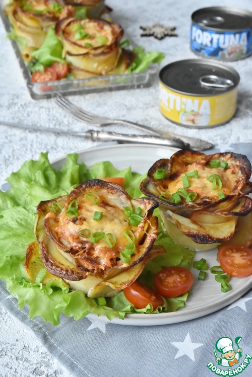 Аппетитные картофельные розочки с начинкой из филе тунца ТМ FORTUNA и овощами станут прекрасной горячей закуской на новогодний стол. Блюдо можно дополнить разнообразными соусами.