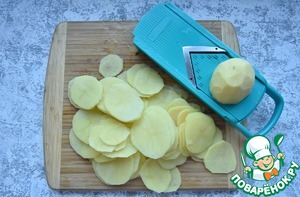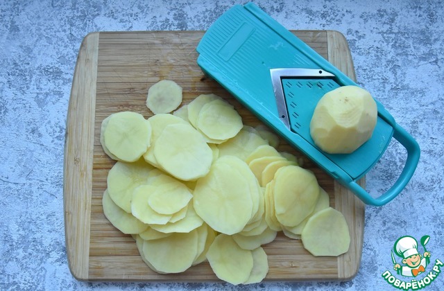 Смазываю ячейки растительным маслом и по бортику начинаю выкладывать картофельные ломтики внахлест. Картофельные ломтики можно слегка увлажнить растительным маслом. На низ также укладываю картофельный ломтик, соответствующий размеру донышка формы.