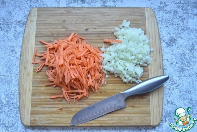 Морковь натираю на терке, лук режу мелким кубиком.