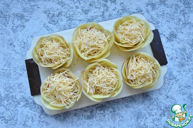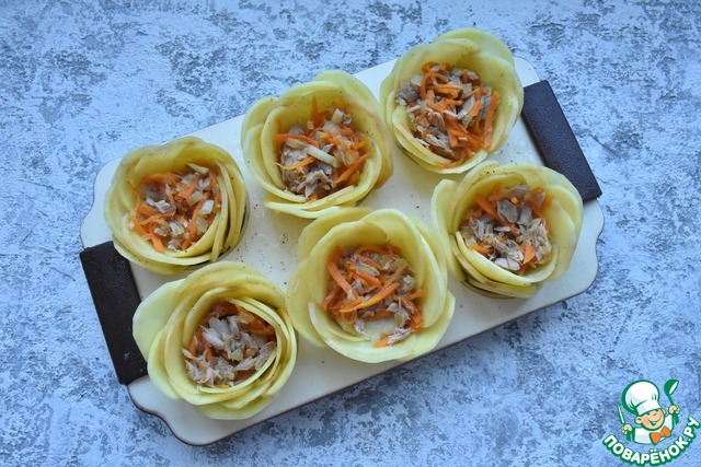 Внутрь каждого получившегося цветочка распределяю начинку. Так как у меня остался картофель, прокладываю им слои начинки. -