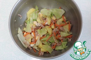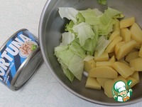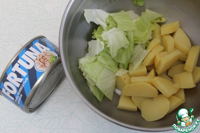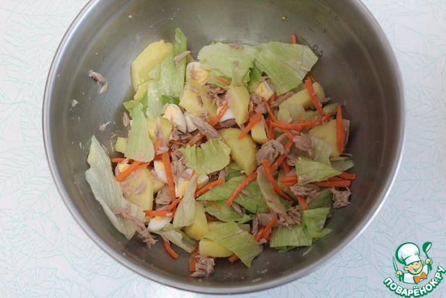 В чашу выложить картофель, порезанный не тонкими четвертинками, добавить айсберг (порвать руками). |