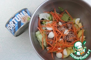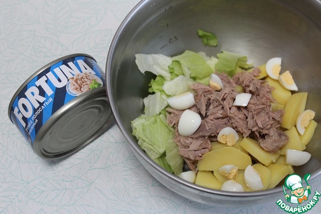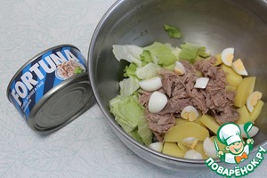 Добавить 3 порезанных яйца, тунец отцедить от сока и добавить. Добавить порезанный полукольцами лук. Если лук не салатный, то порезать, выложить в холодную воду на 5 минут, обсушить. |