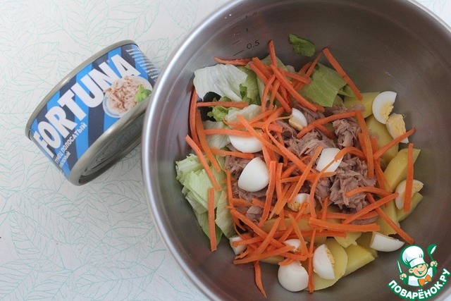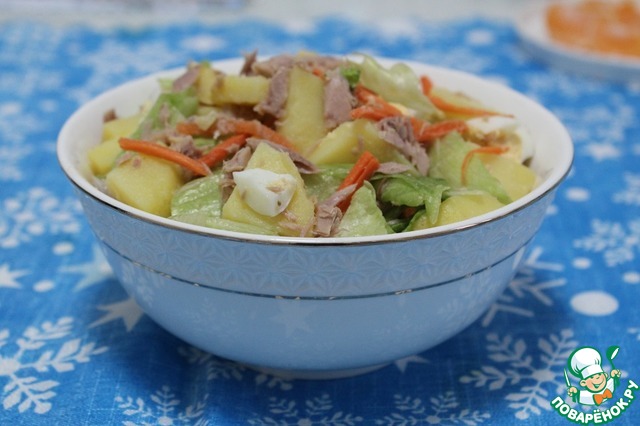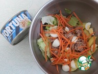 Описание: Вкуснейший салат с тунцом и овощами под пикантной горячей заправкой станет прекрасным дополнением к новогоднему столу. Тунец в собственном соку ТМ Fortuna отлично вписался в салат. Это действительно вкусно! Пробуем?