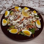 Сверху выложить горячую заправку. Украсить оставшимся яйцом. Перемешать перед подачей. Сразу подавать! |