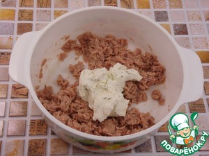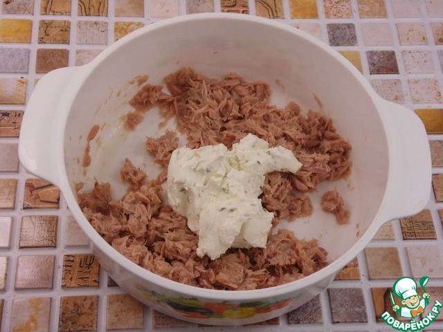 Для начинки тунец в выложить в миску и хорошо размять. Затем смешать его с творожным сыром.