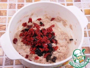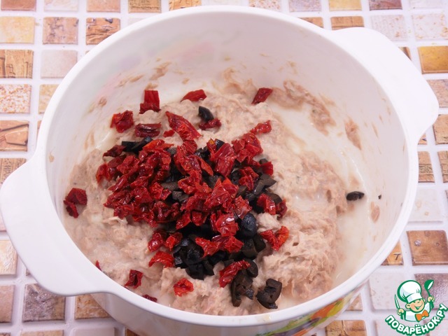 Маслины и вяленые томаты нарезать мелкими кубиками. Выложить их в сырно-рыбную начинку, перемешать.