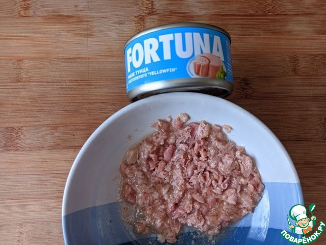 Для приготовления закуски берём консервированный тунец. Без жидкости. У меня - ТМ FORTUNA. Разминаем тунец вилкой.