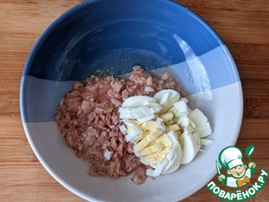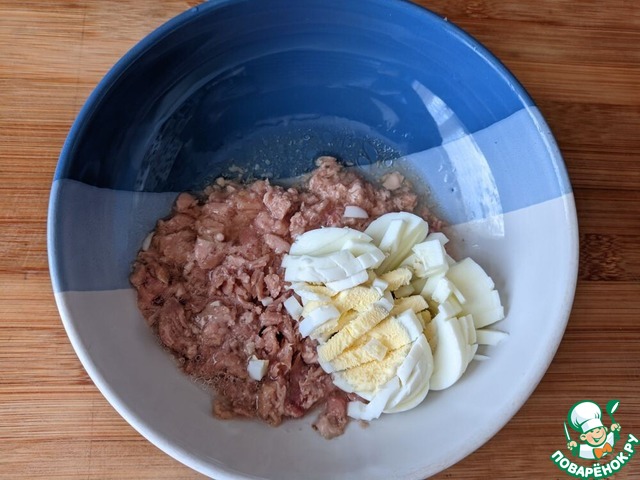 Яйцо режем мелкими кубиками, кладём к тунцу.