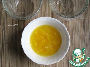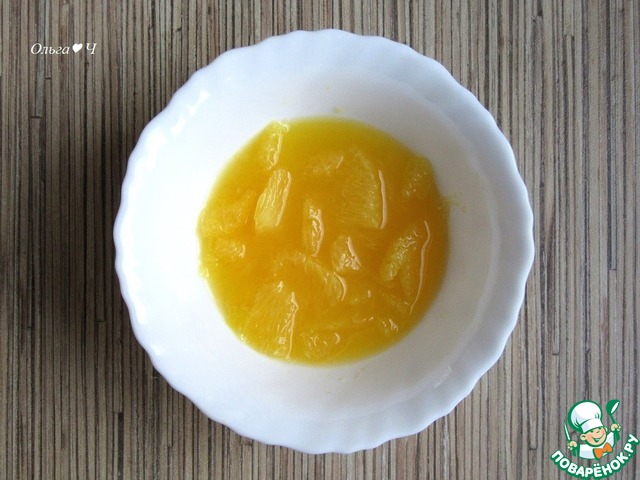 Для апельсинового слоя филируйте апельсин, освободив от кожуры и пленок, нарежьте на маленькие кусочки. Добавьте стекший сок, сахар и лимонный сок, перемешайте.