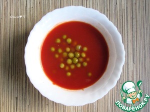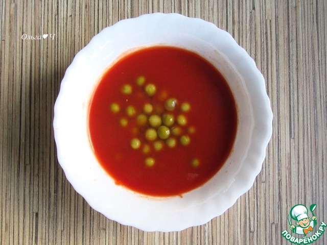Для томатного слоя смешайте теплую воду с томатной пастой или возьмите готовый томатный сок. Добавьте зеленый горошек и соль, перемешайте.