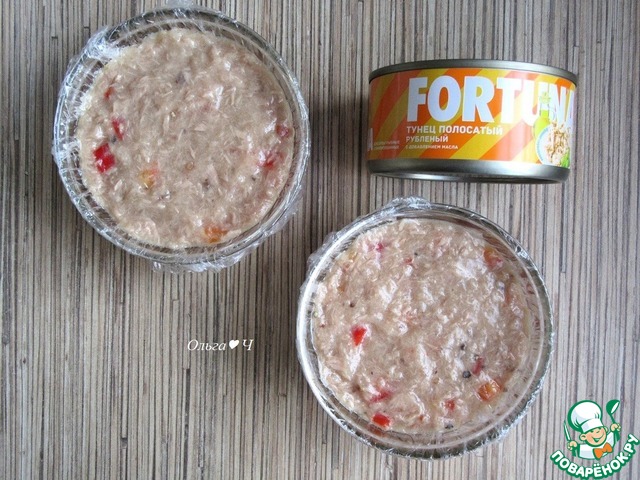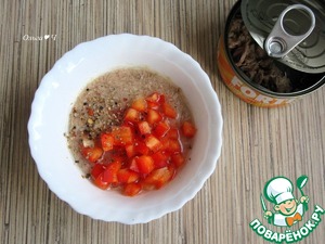 Для рыбного слоя смешайте филе тунца с бульоном, мелко нарезанным красным перцем, солью и смесью перцев.