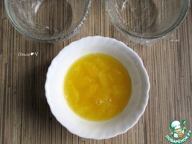 Небольшие формочки или салатники слегка смажьте растительным маслом, застелите пищевой пленкой. Для желе смешайте воду и агар-агар, доведите до кипения, убавьте огонь и варите 2 минуты или как указано на упаковке. Добавьте 5-6 ч. л. горячего желе в подготовленный апельсиновый слой, перемешайте.