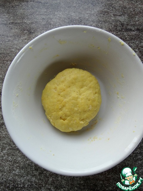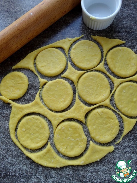 Спустя 10 минут, раскатать тесто в тонкий пласт, вырезать кружочки (диаметр 6 см.).