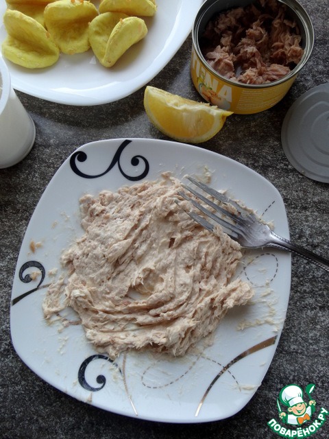 Тунец (вместе с маслом) размять вилкой. Добавить сыр.