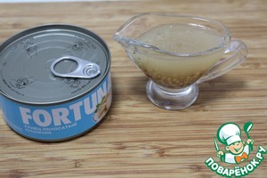 - Тунец (кусочками в собственном соку ТМ Fortuna) — 0.5 бан.