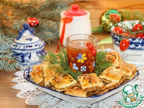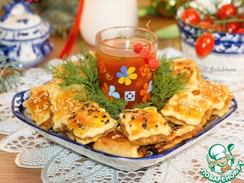 Еще один вариант закуски для праздничного стола - это закуска из слоеного теста с кабачковой икрой, сыром и тунцом.