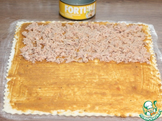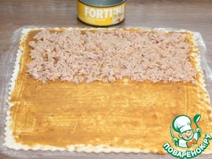8. Раскладываем рыбку на 1/2 часть пласта теста.