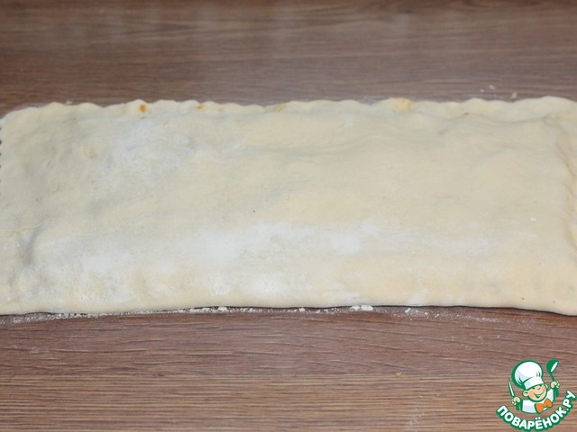 1. Замороженное тесто достаем из морозильной камеры за 20 минут до начала приготовления. Подпыляем столешницу мукой и выкладываем тесто.