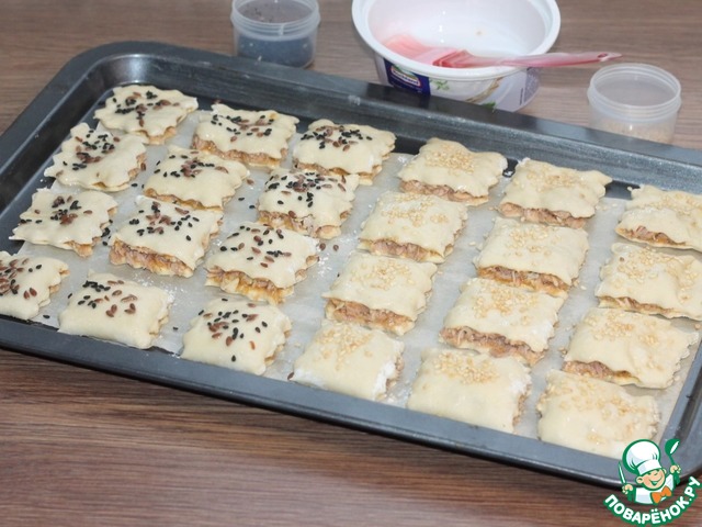 14. Затем смазываем квадратики рыбьим маслом и посыпаем обжаренным на сухой сковороде кунжутом.