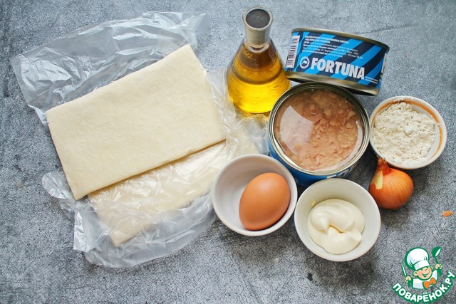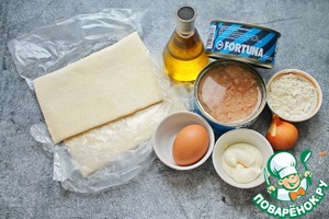 • Подготовьте все необходимые ингредиенты для приготовления закуски "Малышки с тунцом". Тесто разморозьте, с тунца слейте жидкость.