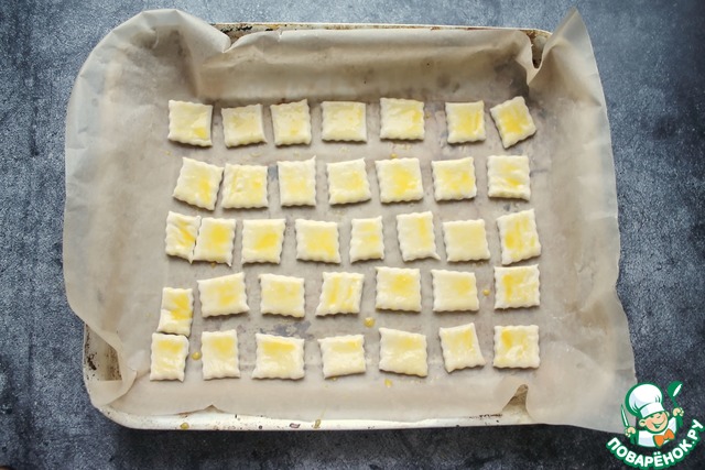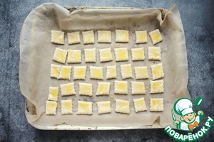 • Немного посыпьте мукой стол и положите тесто. Не раскатывая, порежьте их на квадратики, чтобы можно было в дальнейшем просто положить в рот. Разложите на пергаменте на небольшом расстоянии, покройте и дайте постоять 20-30 минут, чтобы поднялись. Смажьте верх яйцом, только смотрите, чтобы яйцо не стекла на бока. Яйцо заклеит слои, и они не расслоятся.