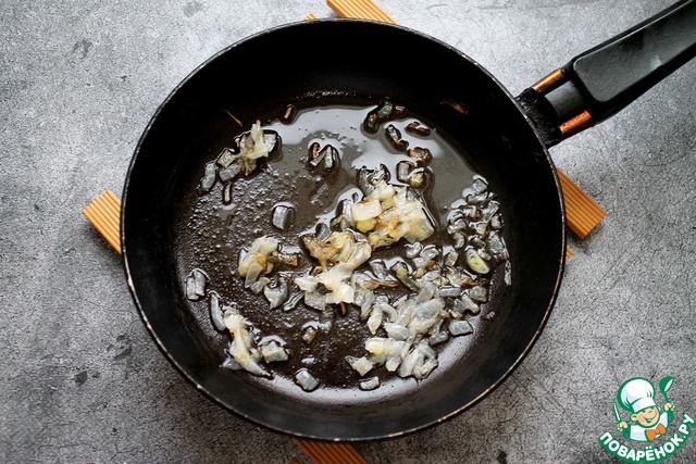 • Репчатый лук порежьте и обжарьте на растительном масле до мягкости, остудите.