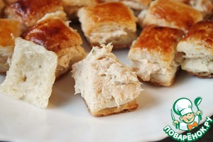 • Каждый квадратик разделите на две части и положите рыбную массу. Сверху положите верхнюю часть и немного прижмите.