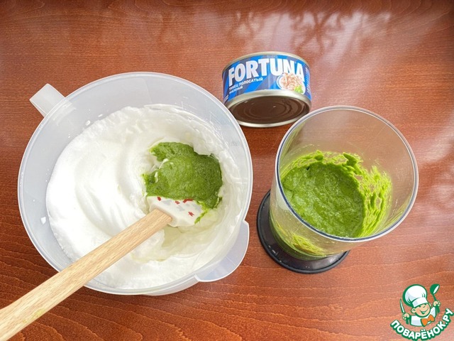 Там все просто.... в чашу блендера или в стакан, поместить 3 желтка, листья шпината и все измельчить... потом всыпать муку и еще раз перемешать до однородности блендером... А потом уже соединить со взбитыми белками.