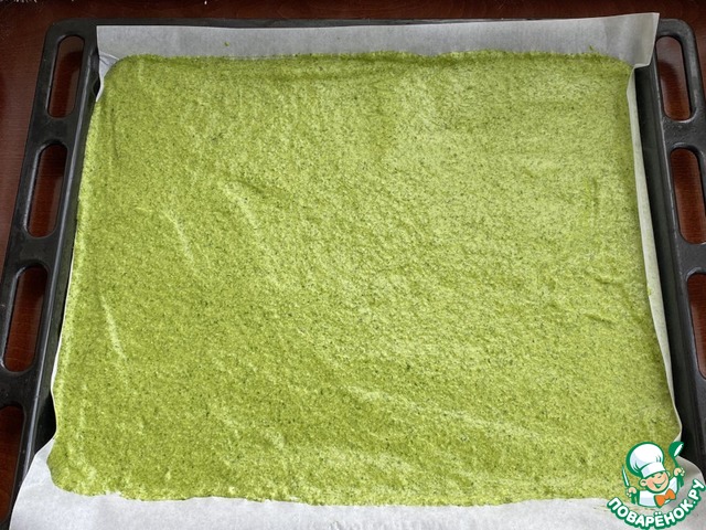 Массу распределите равномерным слоем на противне, застеленным бумагой для выпечки.