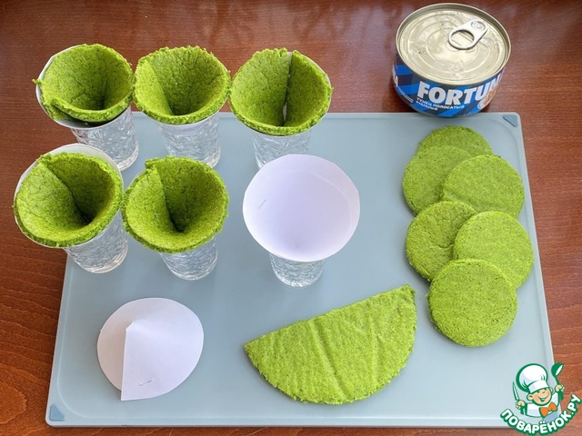 Из бисквита вырежьте заготовки для закуски. У меня получилось 8 штук.