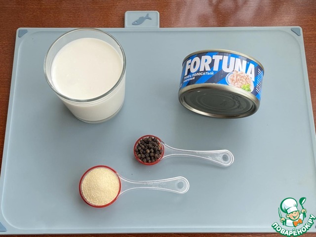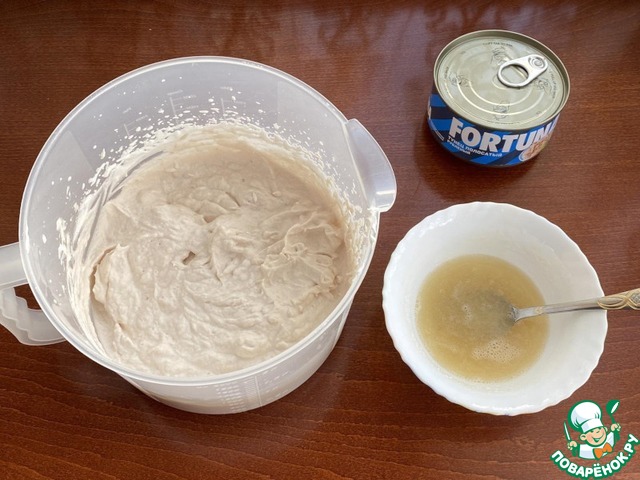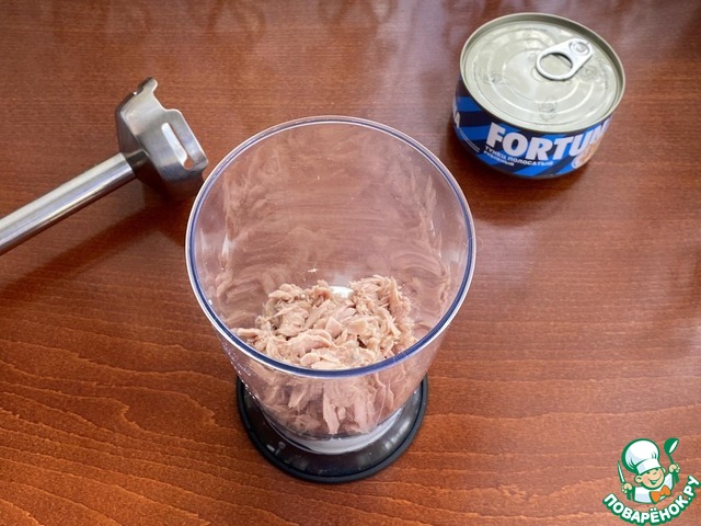Отложите в высокий стакан, немного взбитых сливок, добавьте тунец ТМ "Фортуна" ( жидкость слейте ) и пробейте до однородности погружным блендером.