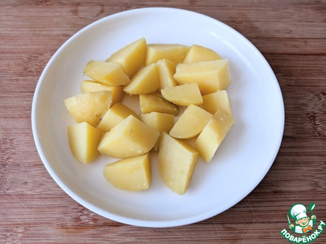 Заранее отвариваем картофель в "мундире" и яйца. Картофель чистим, режем дольками, кладём на блюдо.