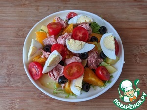 Сверху кладём порезанные пополам маслины и помидоры черри, дольки яиц.