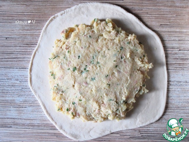 Тесто раскатайте в круг, выложите остывшую начинку.