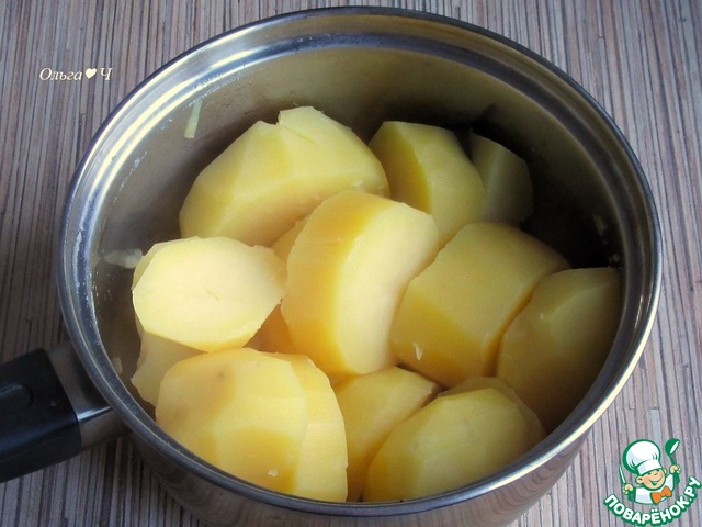 Для начинки отварите картофель с добавлением лука, соли и лаврового листа.