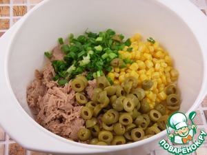 Туда же отправить измельченный зеленый лук и нарезанные колечками оливки.