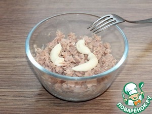 2. Выкладываем тунец без жидкости в миску. Если тунец кусочками, то разминаем его вилкой.