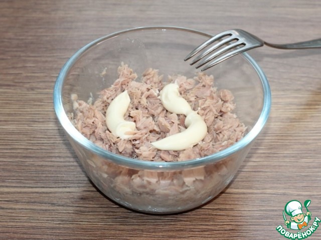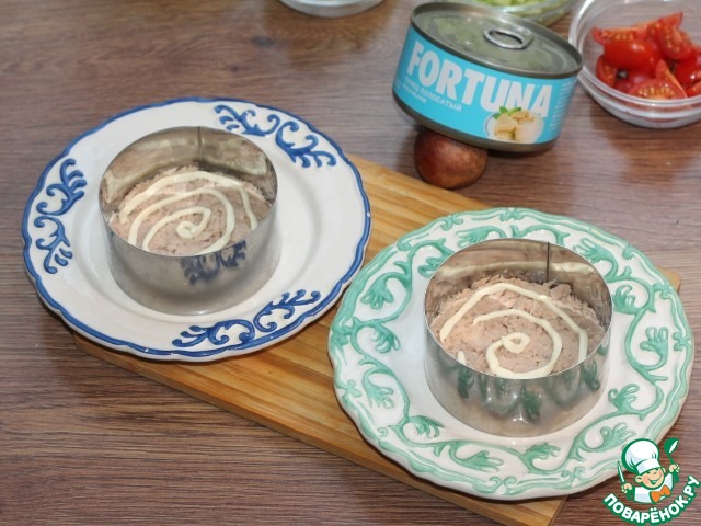 10. Первым слоем выкладываем тунец и смазываем майонезом.