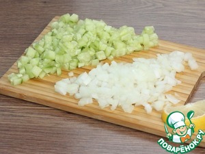 4. Очищаем лук от шелухи. Нарезаем огурец и лук маленькими кубиками.