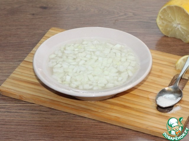 5. Заливаем лук кипятком и добавляем лимонный сок, щепотку соли и сахара. Оставляем лук мариноваться, минут на 15. Затем маринад сливаем через сито.