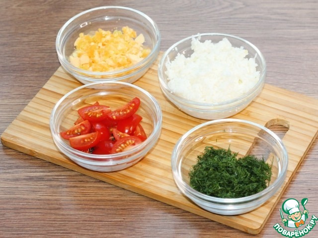 6. Вареные яйца очищаем и разделяем на белки и желтки, трем на мелкой терке. Помидоры черри нарезаем дольками и мелко рубим укроп.